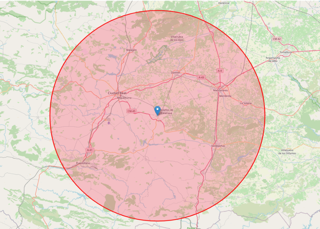 Ilustración 1. Mapa que delimita la zona geográfica en 50 kilómetros a la redonda desde Almagro como centro de la Ruta de la Pasión Calatrava.