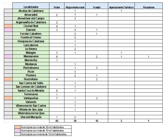 La siguiente tabla recoge el número de alojamientos disponibles en cada uno de los municipios incluidos en la Ruta de la Pasión Calatrava, así como en otras localidades de la comarca, poniendo de manifiesto la solidez de su infraestructura turística y su potencial de crecimiento.